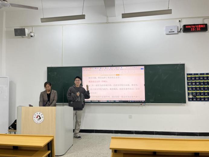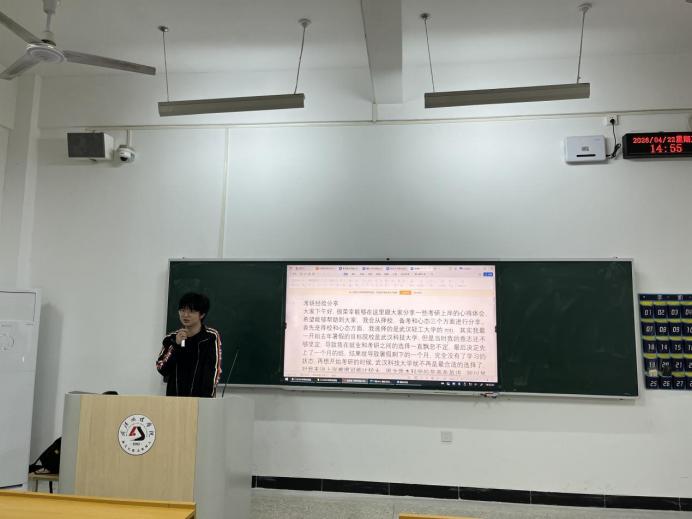 袁慎极分享了短期高效备考的冲刺经验,提醒同学们重视基础知识的全面掌握,避免盲目押题。他结合自身复习经历,介绍了翻译资料高效背诵与政治重点梳理方法,鼓励大家在有限时间内精准发力、高效复习,以扎实准备实现逆袭。