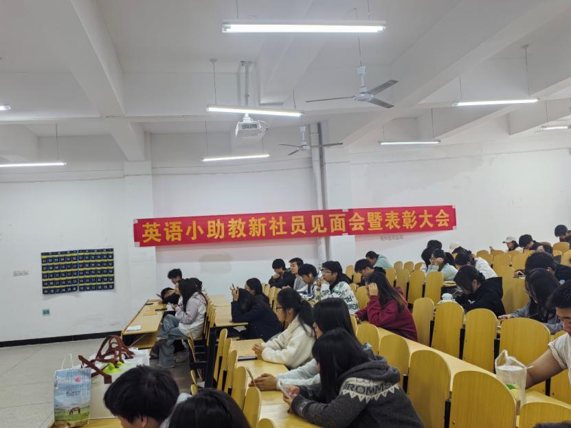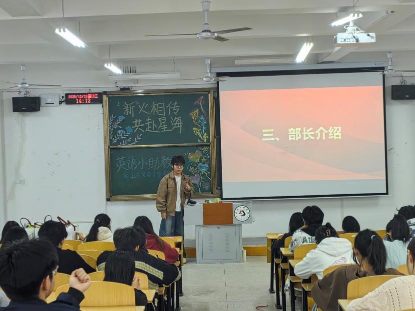 10月29日,以“‘薪’火相传,共赴星海”为主题的新成员见面会温暖启幕,活动回顾往届精彩瞬间,表彰优秀助教、“单词王者”及四六级分享会突出贡献者,各部长依次介绍部门职能与工作方向,新老成员自此结为“一家人”,共同踏上英语分享与能力提升的成长之旅。